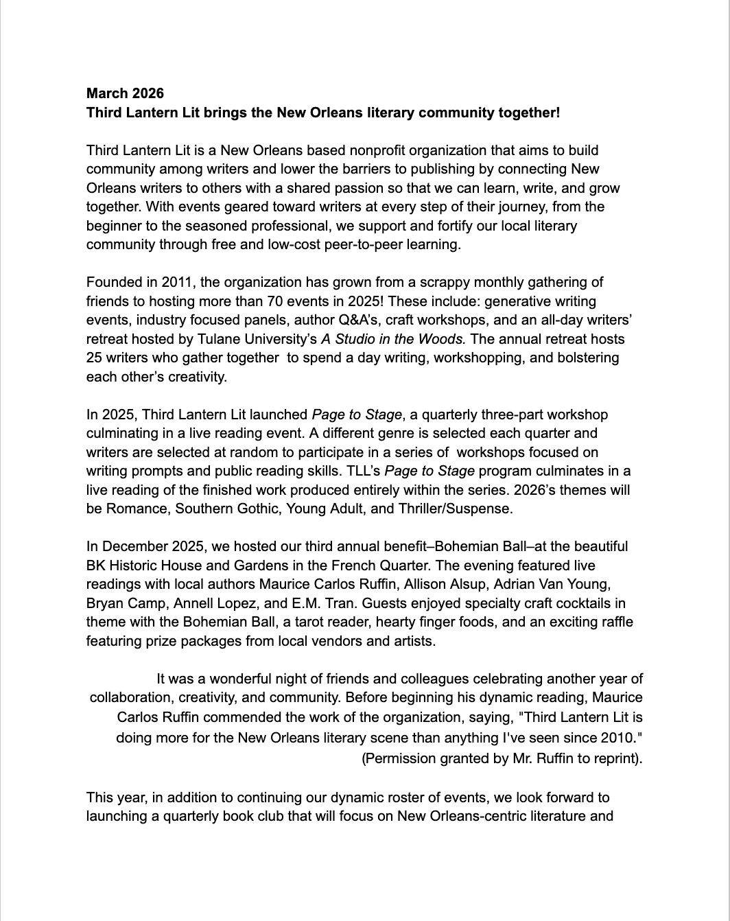 Press "Third Lantern Lit is doing more for the New Orleans literary scene than anything I've seen since 2010." — Maurice Carlos Ruffin Read all about us TLL 2026 Press Release Antigravity March 2026 TLL’s Director of Community Outreach, Daphne Armbruster, in an interview with NPR.